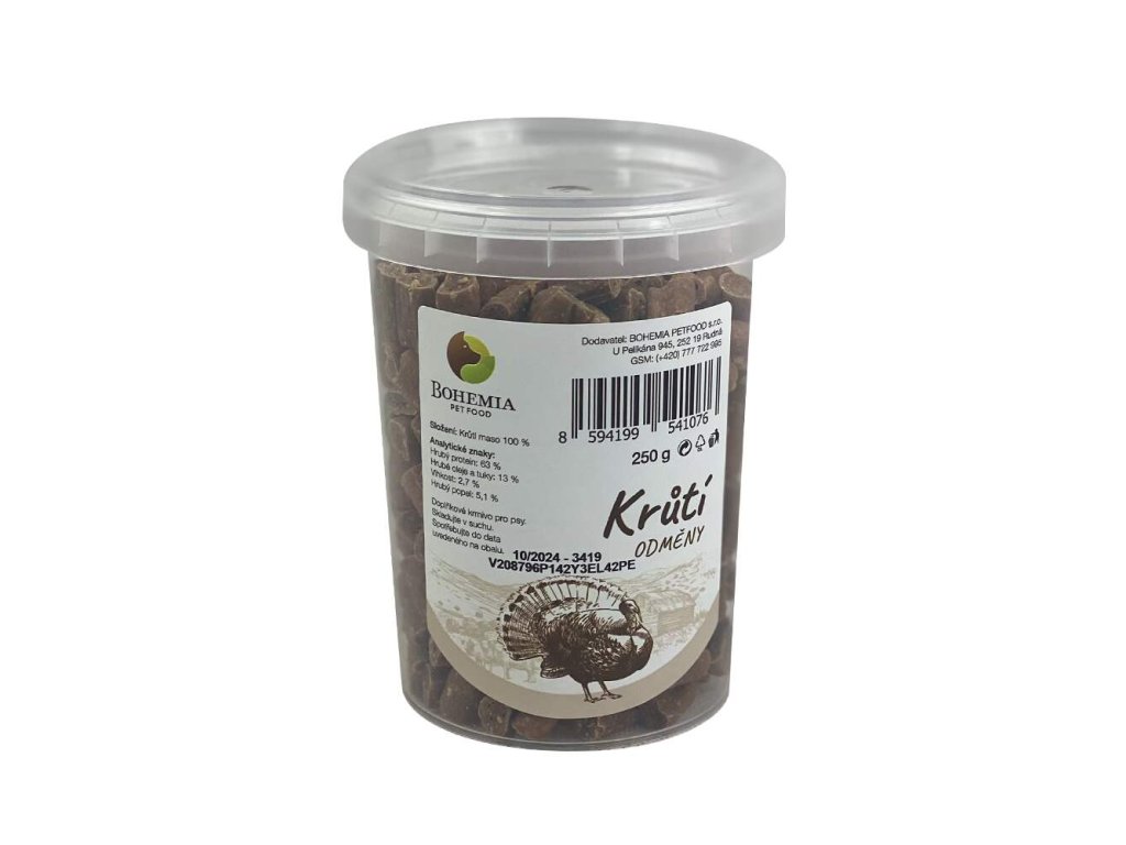Odměny v podobě kousků tyčinek ze sušeného krůtího masa pro psy.